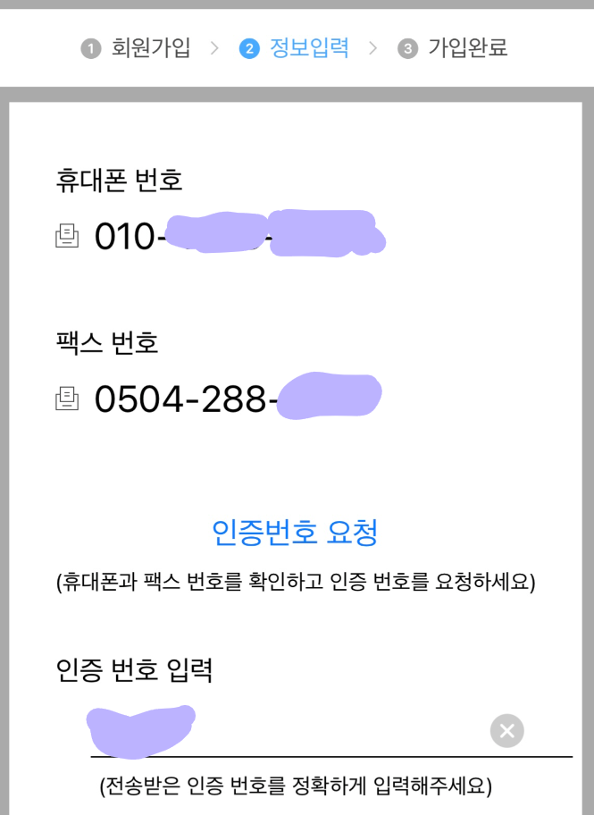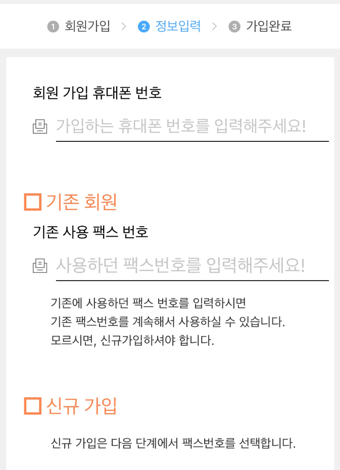 휴대폰 번호와 신규 가입란에 체크! 기존 사용 팩스 번호가 있다면 적어줍니다.
