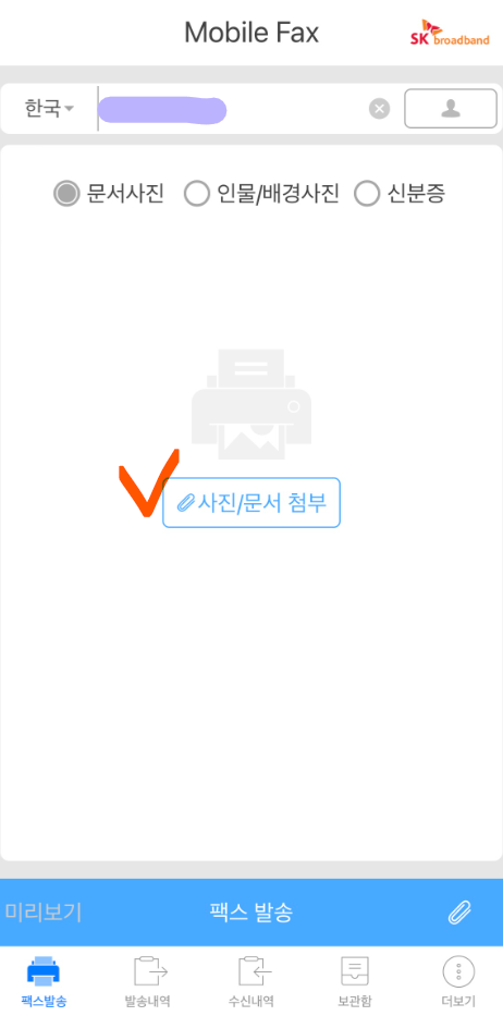6. 번호 입력 후 화면 중앙의 사진/문서 첨부 터치