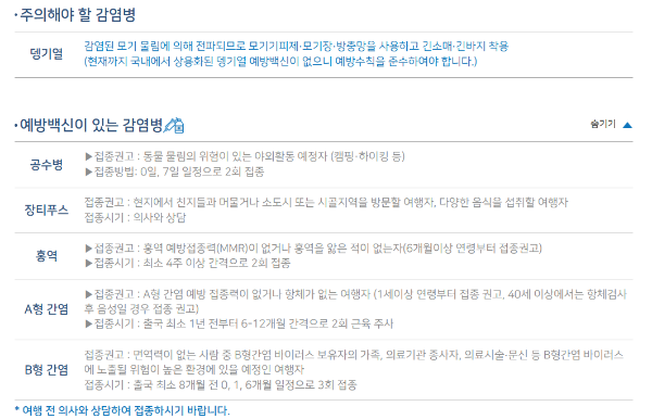 이런식으로 국가별로 주의해야 할 감염병과 예방백신이 있는 감염병을 친절하게 안내해줍니다.