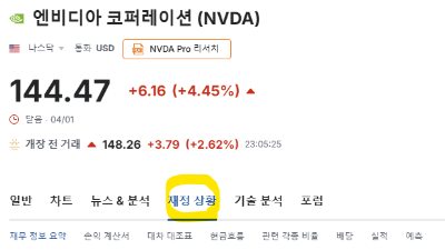 검색하시면 엔비디아가 나오고 주가 바로 밑에 <재정 상황>을 눌러주세요.