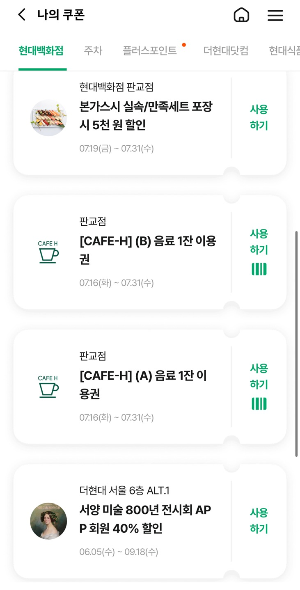 현대백화점 앱에서 일단 자주가는 지점을 지정해주셔야 합니다. 저는 판교점을 주로 이용해서 판교점으로 등록하였습니다. 그리고 다시 마이페이지-> 현대백화점으로 접속하시면 자주가는 지점에서 준 쿠폰들을 쭉 확인할 수 있습니다. 여기서 CAFE-H 음료 1잔 이용권이 있는 것을 확인할 수 있습니다. 이건 어떤 주기로 지급하는지 잘 모르겠는데, 벌써 무료커피로 4잔정도 마셨습니다;; 만약 현대백화점 판교점이시면 백화점 10층에 카페가 있습니다. 10층 올라가셔서 고객센터 방향말고, 반대방향으로 쭉 걸어가시면 CAFE-H가 있어요~ 거기서 줄을 서시고, 차례가되면 바코드를 보여주시면 됩니다. 줄도 많이 안길고 회전율이 빨라서 금방 금방 커피를 받을 수 있습니다. 참고로 테이크아웃만 가능합니다. 근데 일반 카페처럼 메뉴가 많은 건 아니고, 아메리카노(hot/ice), 간단한 티, 주스정도 있었던 것 같습니다. 커피 받아서 옆에 하늘정원도 있거든요? 거기 거닐어도 너무 좋을 것 같더라구요. 예쁘게 잘 해놨어요.