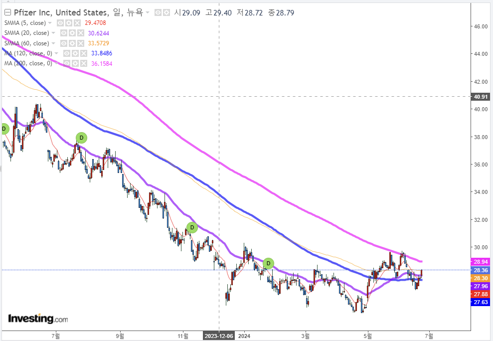 1. 화이자(PFE) 주가 추세보기, 화이자 주가 하락