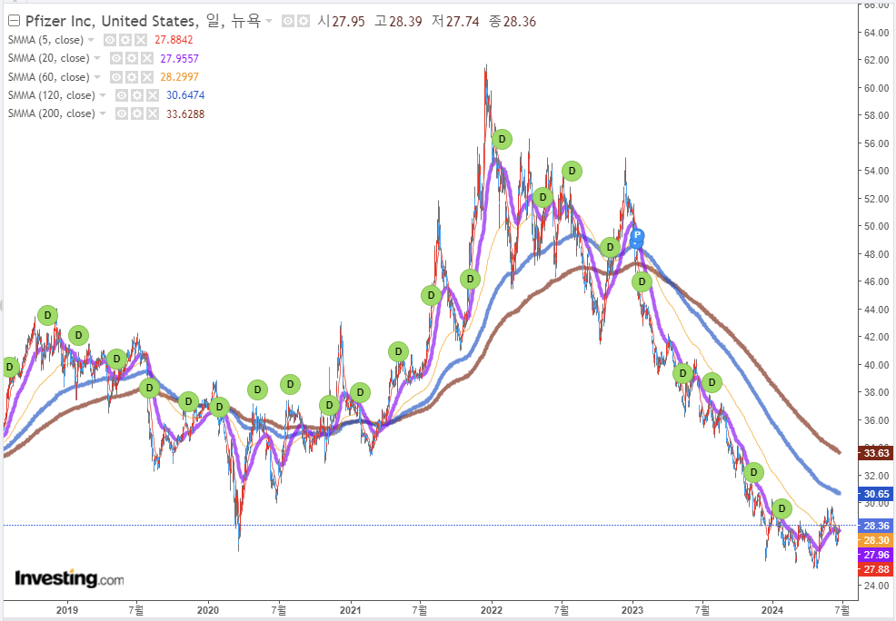 2019년부터 2024년 현재까지의 화이자 주가 차트입니다.