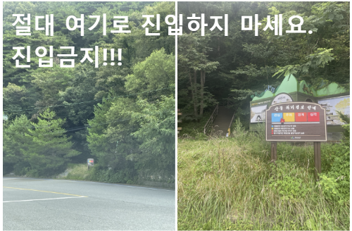 주차장에 주차하시면 저런 입구가 바로 보입니다. 아무런 의심없이 저기로 갔는데, 전혀! 관리가 되고 있지 않았어요. 초반에 뱀 나왔을 때 바로 내려왔어야 하는데, 저는 여기로 그냥 올라갔습니다. 이 코스 말고,