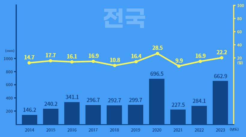 위 그래프는 최근 10년간 장마기간 강수량 및 강수일수입니다.