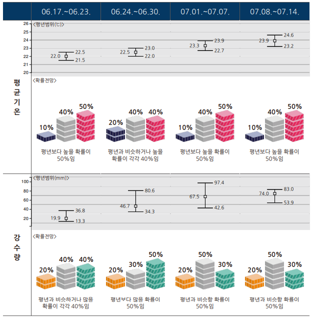 상기 그래프와 같이 1개월 강수량 전망을 보면 6월 24일부터 7월 14일까지 평년과 비슷하거나 강수량이 더 많을 확률이 50%이며 예상 강수량 또한 평년치의 범주안에 속해있습니다. 3개월 전망의 경우 6월은 평년과 비슷할 확률이 50%, 7,8월은 평년과 비슷하거나 많을 확률이 각각 40%입니다.